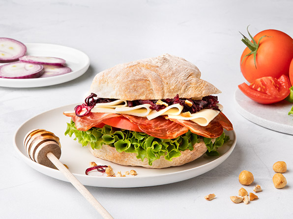 4.Disponha o Queijo Castelões, por cima a cebola caramelizada e termine com as avelãs torradas picadas.